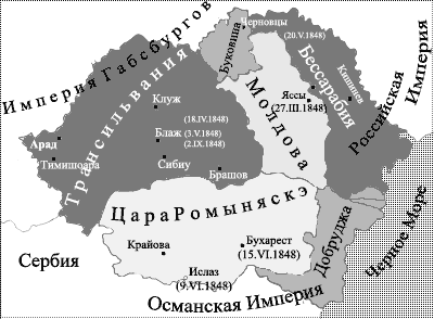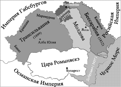 Княжества Молдова, Цара Ромыняскэ, Трансильвания и отчужденные румынские территории к началу XIX века (в скобках указана дата аннексии):